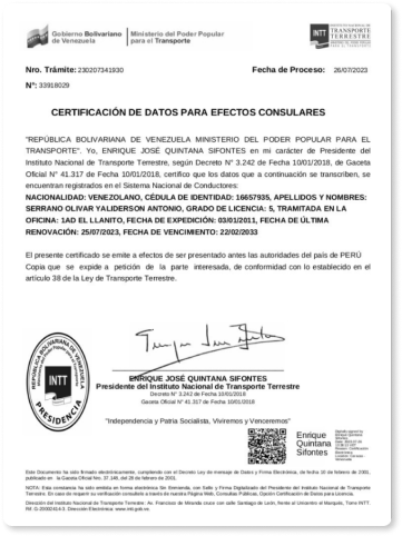 Certificación de datos para efectos consulares (INTT)